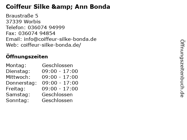 | Öffnungszeiten Coiffeur Silke & Ann Bonda in Worbis anzeigen | |