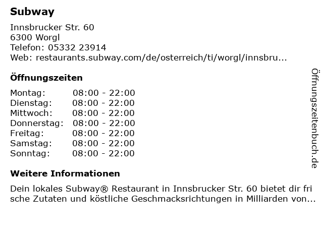 | Öffnungszeiten Subway in Worgl anzeigen | |