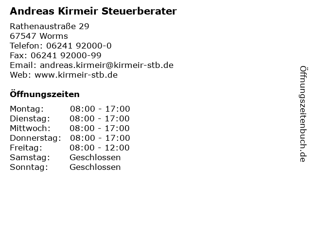 | Öffnungszeiten Andreas Kirmeir Steuerberater in Worms anzeigen | |