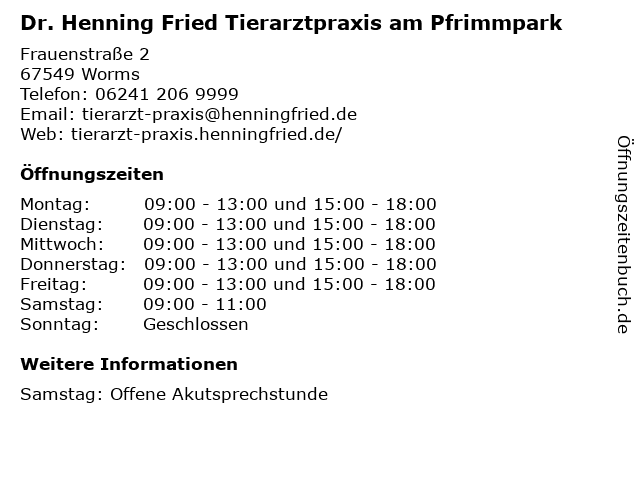 Branchen & Suchbegriffe zu Dr. Henning Fried Tierarztpraxis am Pfrimmpark:arztpraxis, dr., fried, henning, pfrimmpark, tierarzt, tierarztpraxis, tierhilfe, tierrettung |