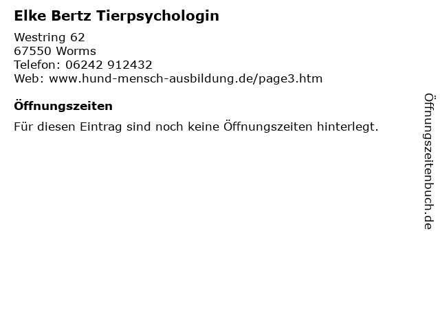 | Öffnungszeiten Elke Bertz Tierpsychologin in Worms anzeigen | |