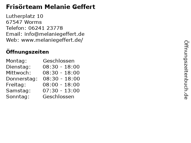 Öffnungszeiten Frisörteam Melanie Geffert in Worms anzeigen | |