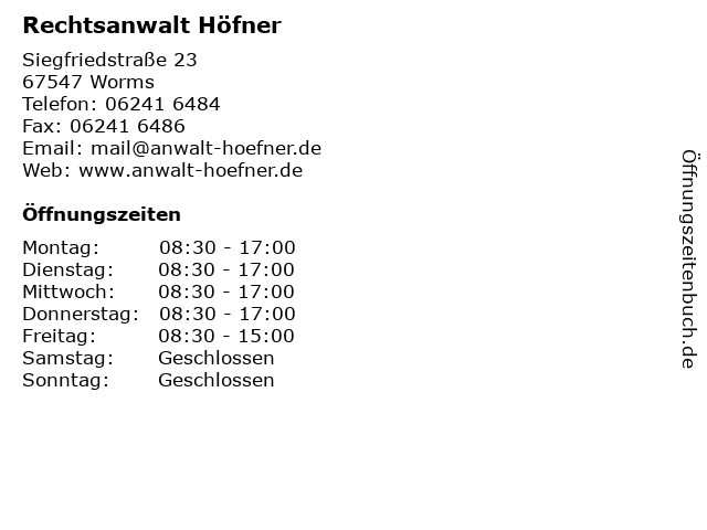 | Öffnungszeiten Rechtsanwalt Höfner in Worms anzeigen | |