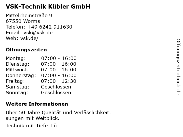 | Öffnungszeiten VSK-Technik Kübler GmbH in Worms anzeigen | |