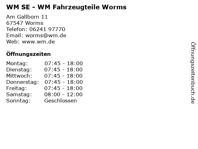| Öffnungszeiten WM SE - WM Fahrzeugteile Worms in Worms anzeigen | |