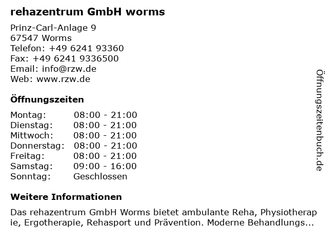 | Öffnungszeiten rehazentrum GmbH worms in Worms anzeigen | |