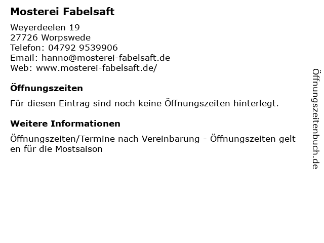 | Öffnungszeiten Mosterei Fabelsaft in Worpswede anzeigen | |