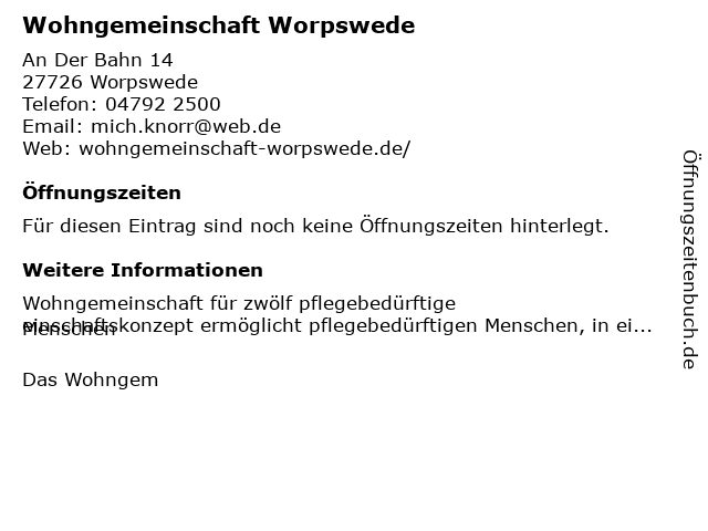 | Öffnungszeiten Wohngemeinschaft Worpswede in Worpswede anzeigen | |