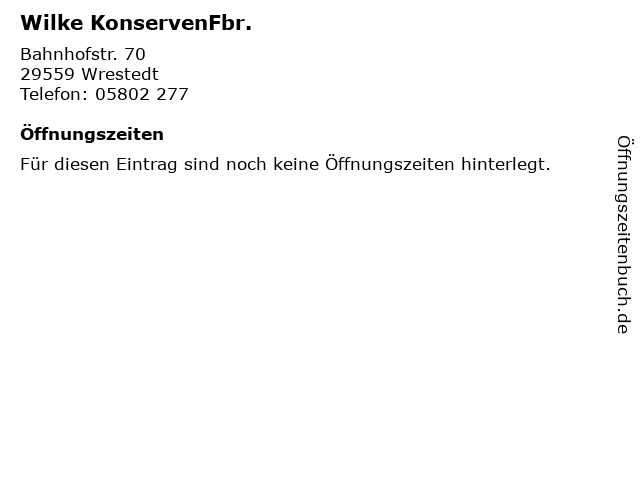 | Öffnungszeiten Wilke KonservenFbr. in Wrestedt anzeigen | |