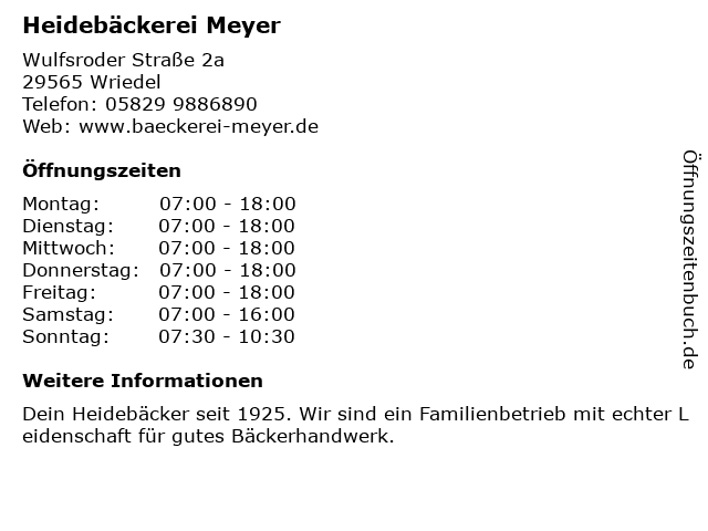 | Öffnungszeiten Heidebäckerei Meyer in Wriedel anzeigen | |