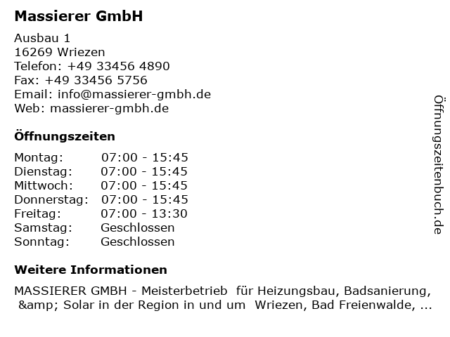 | Öffnungszeiten Massierer GmbH in Wriezen anzeigen | |