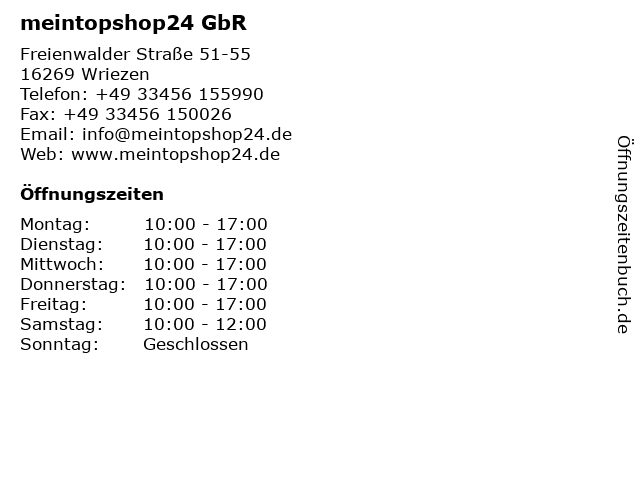 | Öffnungszeiten meintopshop24 GbR in Wriezen anzeigen | |