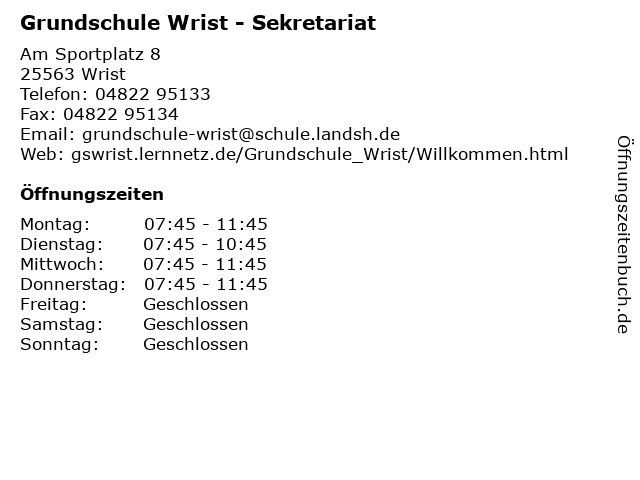 | Öffnungszeiten Grundschule Wrist - Sekretariat in Wrist anzeigen | |