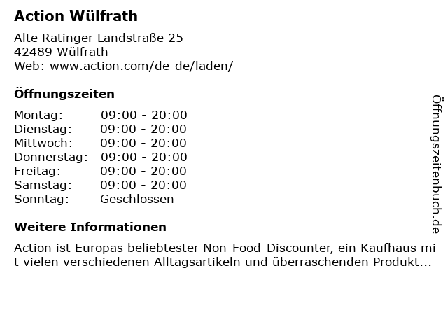 | Öffnungszeiten Action Wülfrath in Wülfrath anzeigen | |