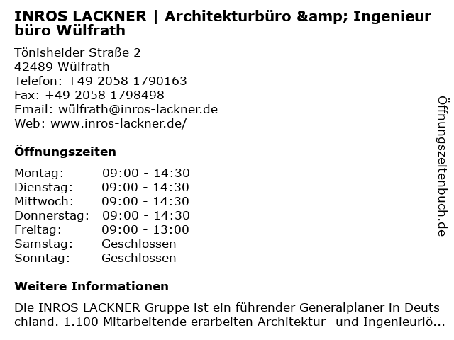 2 Juhr - Architekturbüro für Industriebau- und Gesamtplanung (Entfernung: 4,54 km) Nevigeser Str. 520, 42111 Wuppertal 5 Koch-Kohlstadt, Michael Dipl.Ing Architekturbüro (Entfernung: 7,64 km) Schleswiger Str. 61, 42107 Wuppertal 6 Dipl.-Ing. & Architekt Rolf Schneiders Architekturbüro (Entfernung: 9,63 km) Siegesstr. 44, 42103 Wuppertal |