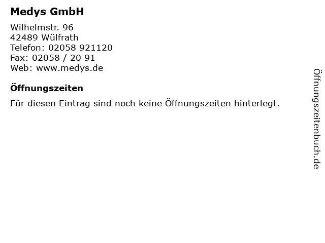| Öffnungszeiten Medys GmbH in Wülfrath anzeigen | |
