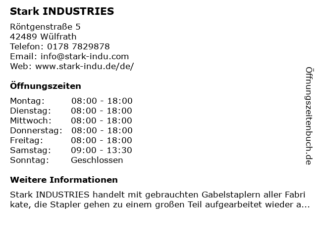 | Öffnungszeiten Stark INDUSTRIES in Wülfrath anzeigen | |