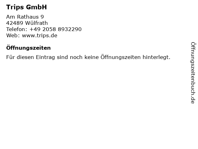 | Öffnungszeiten Trips GmbH in Wülfrath anzeigen | |
