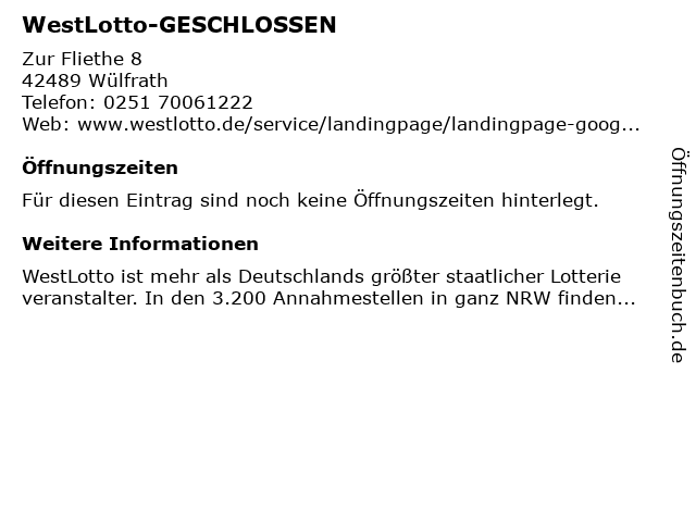 | Adresse WestLotto-GESCHLOSSEN in Wülfrath anzeigen |