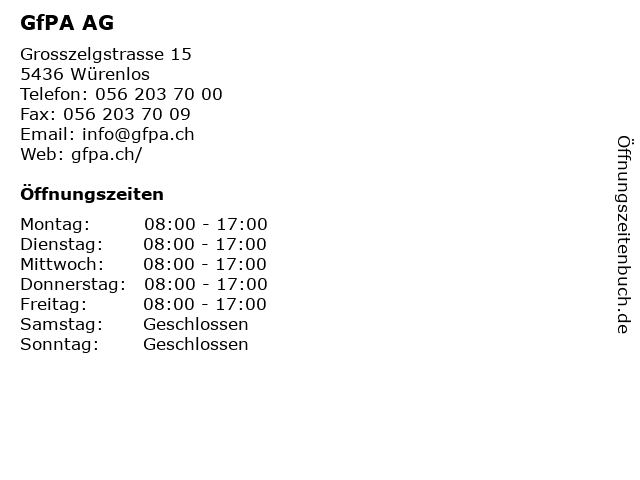| Öffnungszeiten GfPA AG in Würenlos anzeigen | |