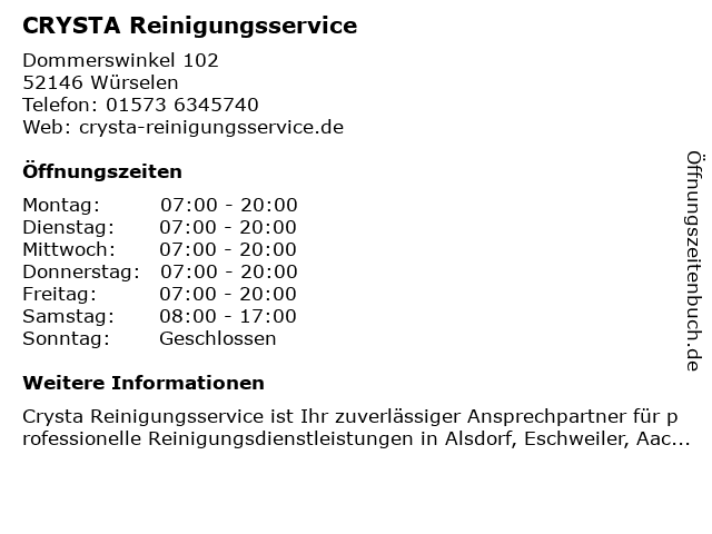| Öffnungszeiten CRYSTA Reinigungsservice in Würselen anzeigen | |