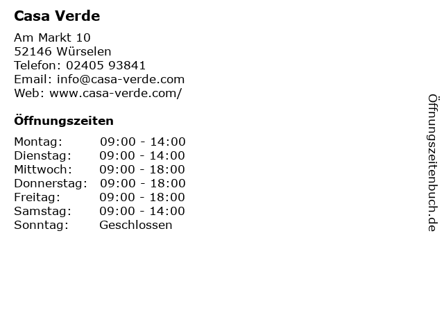 | Öffnungszeiten Casa Verde in Würselen anzeigen | |