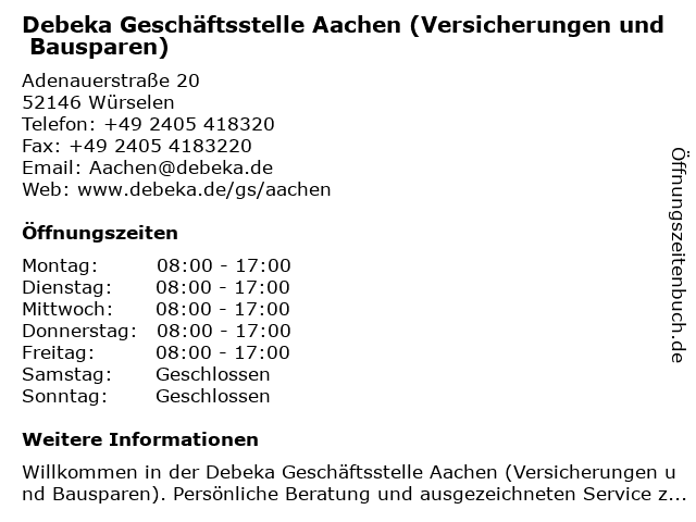 1 Debeka Geschäftsstelle Düren/Aachen Land (Versicherungen und Bausparen) (Entfernung: 0,24 km) Adenauerstraße 20, 52146 Würselen 3 Debeka Servicebüro Aachen Templergraben (Versicherungen und Bausparen) (Entfernung: 6,16 km) Templergraben 38, 52062 Aachen 4 Debeka Servicebüro Aachen Freunder Landstraße (Versicherungen und Bausparen) (Entfernung: 6,22 km) Freunder Landstraße 6, 52078 Aachen 6 Debeka Servicebüro Herzogenrath (Versicherungen und Bausparen) (Entfernung: 8,16 km) Kleikstraße 96, 52134 Herzogenrath |