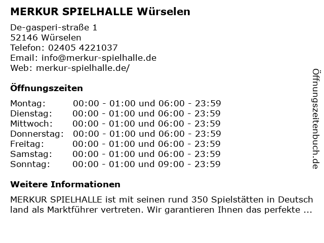 | Öffnungszeiten MERKUR SPIELHALLE Würselen in Würselen anzeigen | |