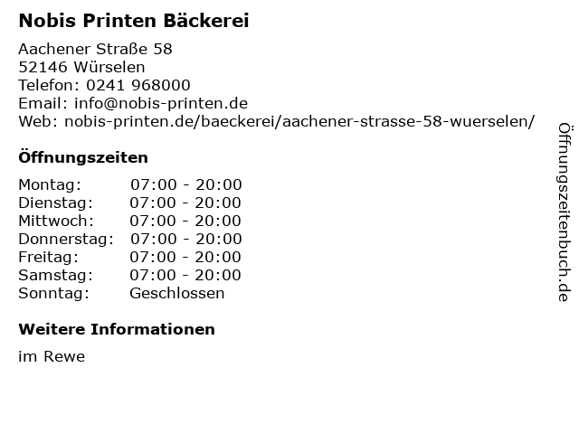 Nobis Printen Bäckerei in Würselen: Telefonnummer, Öffnungszeiten und Adresse