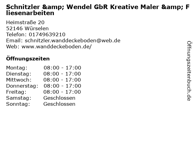 3 DEVK Versicherung Jörg Schnitzler Bezirksverkaufsleiter (Entfernung: 2,72 km) Sebastianusstraße 40a, 52146 Würselen 4 Wilfried Wolter Maler- und Anstreicherarbeiten (Entfernung: 4,04 km) Blumenrather Str. 94, 52477 Alsdorf 6 |