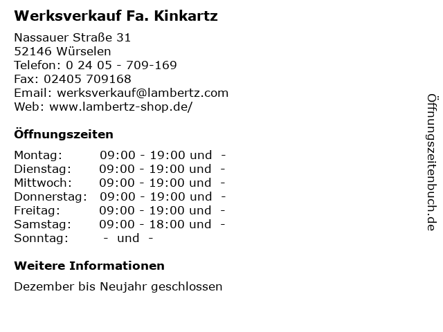 | Öffnungszeiten Werksverkauf Fa. Kinkartz in Würselen anzeigen | |