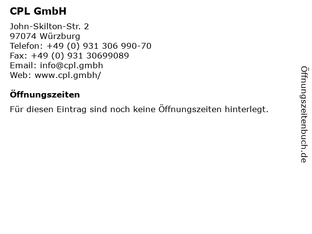 | Öffnungszeiten CPL GmbH in Würzburg anzeigen | |