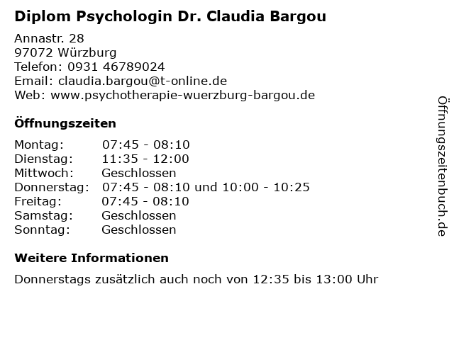 Branchen & Suchbegriffe zu Diplom Psychologin Dr. Claudia Bargou:bargou, claudia, diplom, dr., dr.phil.dipl., psych., psychologin, psychotherapeut, sprechzeiten, versorgung |