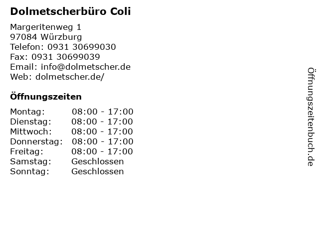 | Öffnungszeiten Dolmetscherbüro Coli in Würzburg anzeigen | |