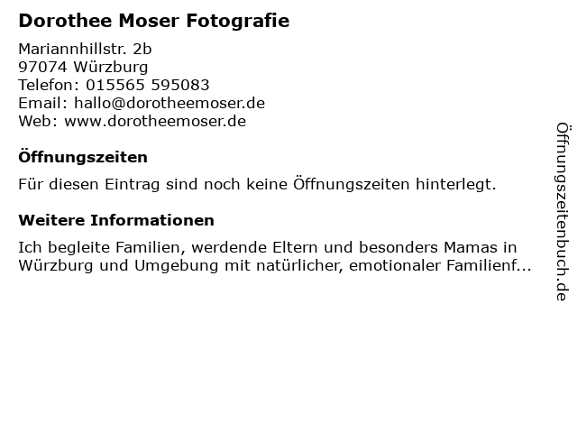 | Öffnungszeiten Dorothee Moser Fotografie in Würzburg anzeigen | |