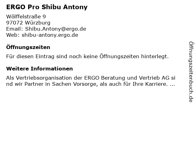| Öffnungszeiten ERGO Pro Shibu Antony in Würzburg anzeigen | |