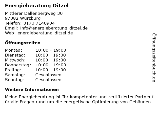 | Öffnungszeiten Energieberatung Ditzel in Würzburg anzeigen | |