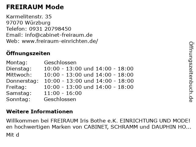 | Öffnungszeiten FREIRAUM Mode in Würzburg anzeigen | |