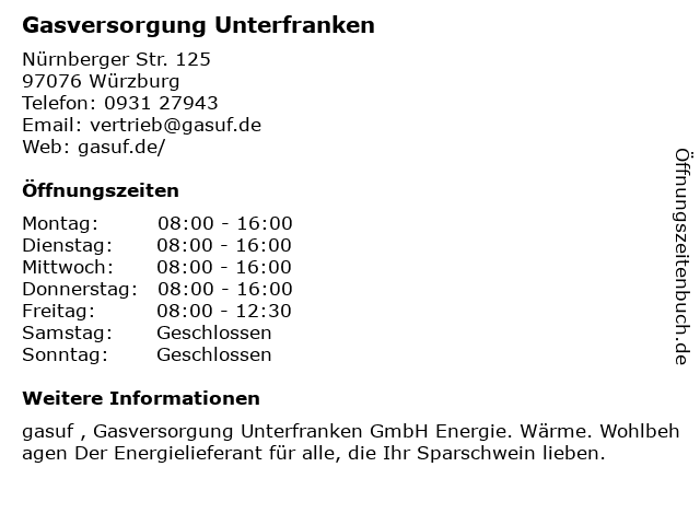 | Öffnungszeiten Gasversorgung Unterfranken in Würzburg anzeigen | |