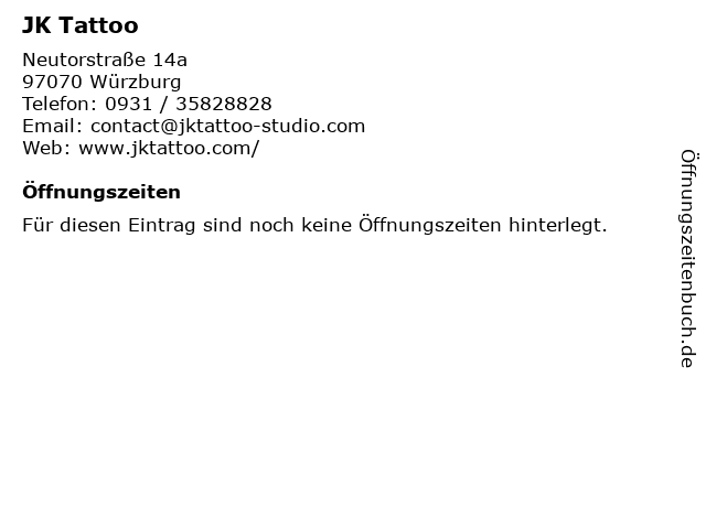 | Öffnungszeiten JK Tattoo in Würzburg anzeigen | |