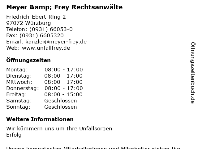 | Öffnungszeiten Meyer & Frey Rechtsanwälte in Würzburg anzeigen | |