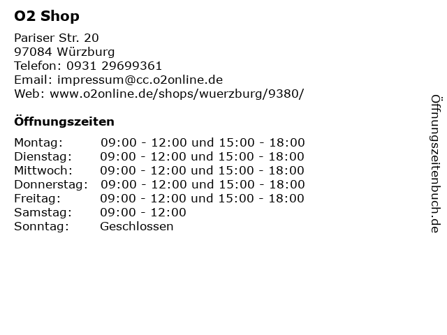 | Öffnungszeiten O2 Shop in Würzburg anzeigen | |