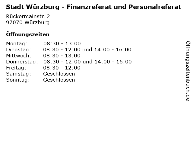 | Öffnungszeiten Stadt Würzburg - Finanzreferat und Personalreferat in Würzburg anzeigen | |