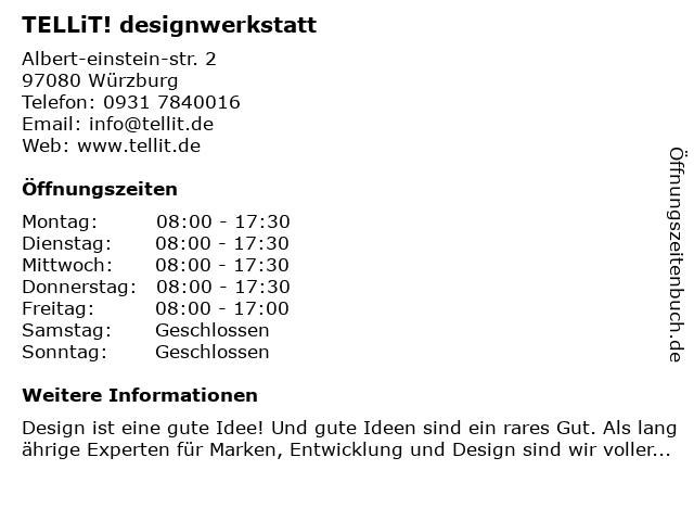 | Öffnungszeiten TELLiT! designwerkstatt in Würzburg anzeigen | |