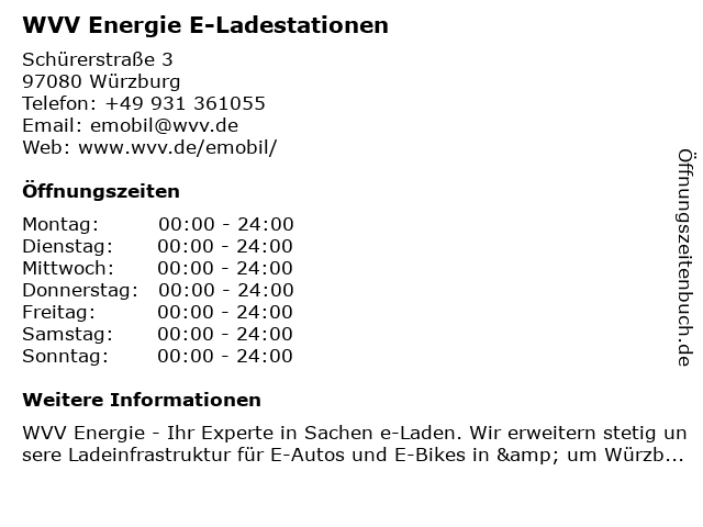 | Öffnungszeiten WVV Energie E-Ladestationen in Würzburg anzeigen | |