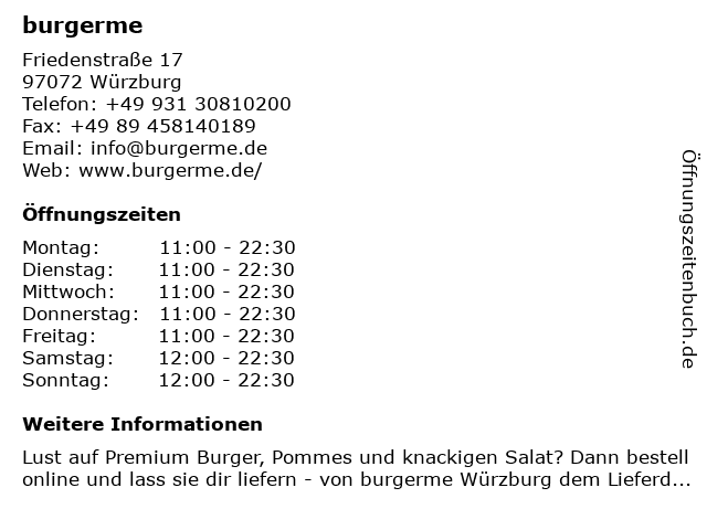 | Öffnungszeiten burgerme in Würzburg anzeigen | |