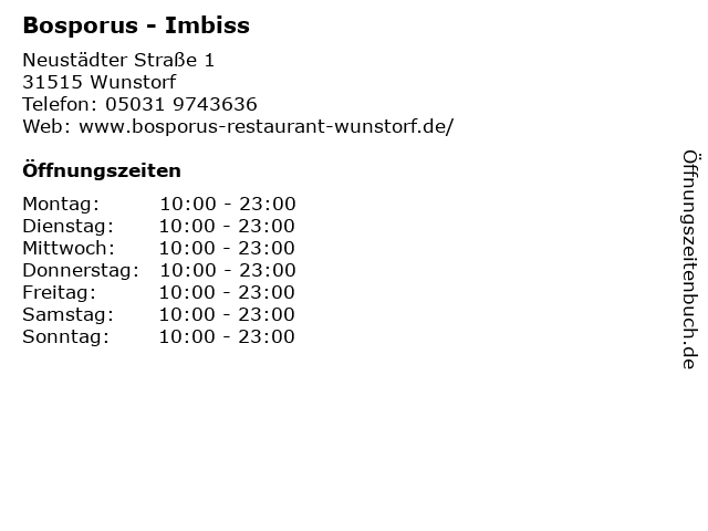 | Öffnungszeiten Bosporus - Imbiss in Wunstorf anzeigen | |