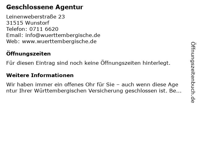 Öffnungszeiten Geschlossene Agentur in Wunstorf anzeigen