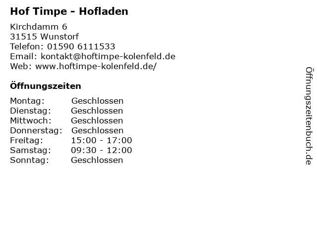 | Öffnungszeiten Hof Timpe - Hofladen in Wunstorf anzeigen | |