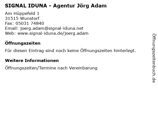| Öffnungszeiten SIGNAL IDUNA - Agentur Jörg Adam in Wunstorf anzeigen | |